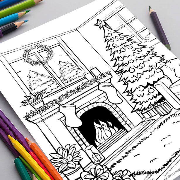 It’s Christmas time! Colour cheerful scenes filled with gifts, Christmas trees, and cozy fireplaces.